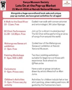 Bookings: 0724 255299 or info@kenyamuseumsociety.org