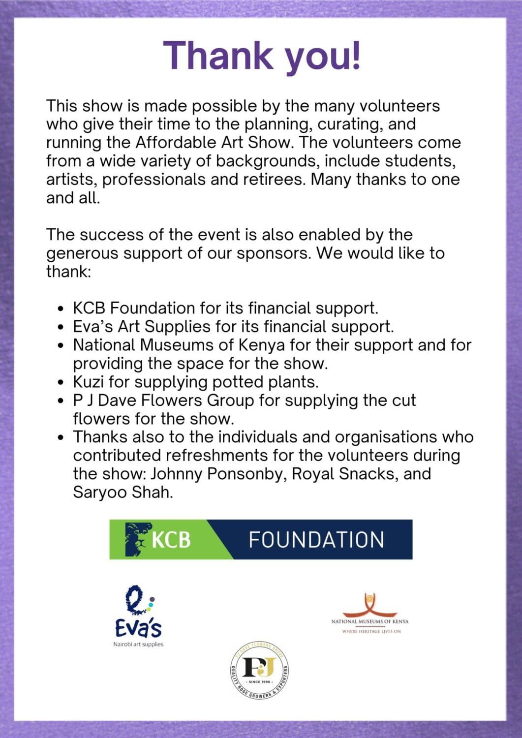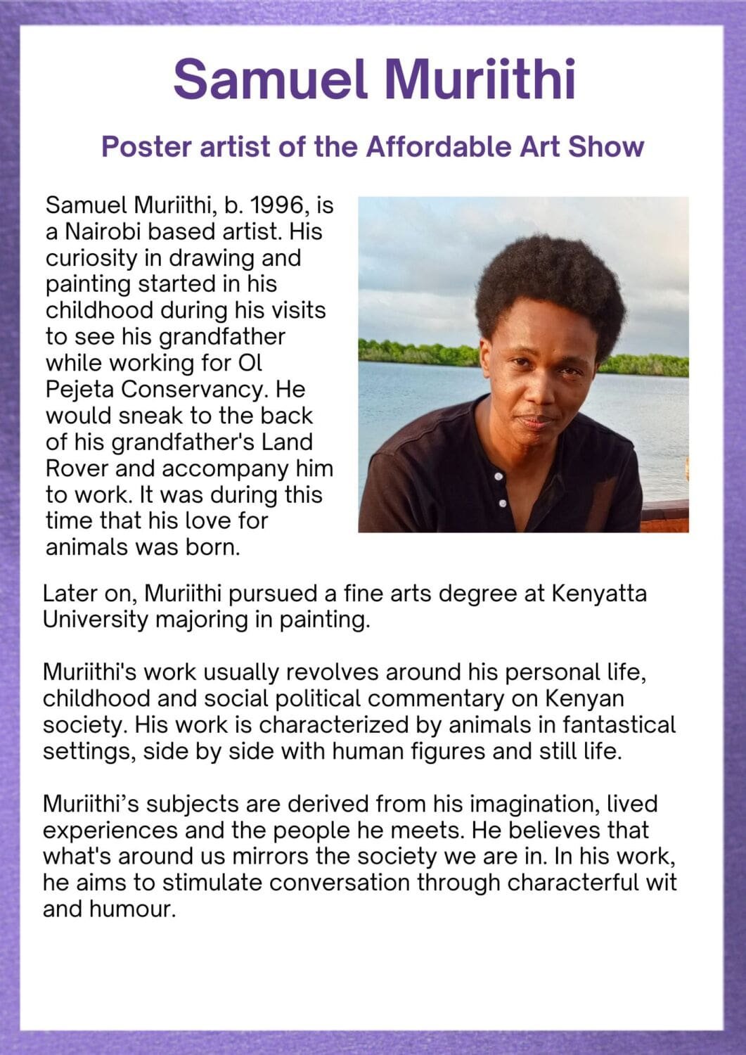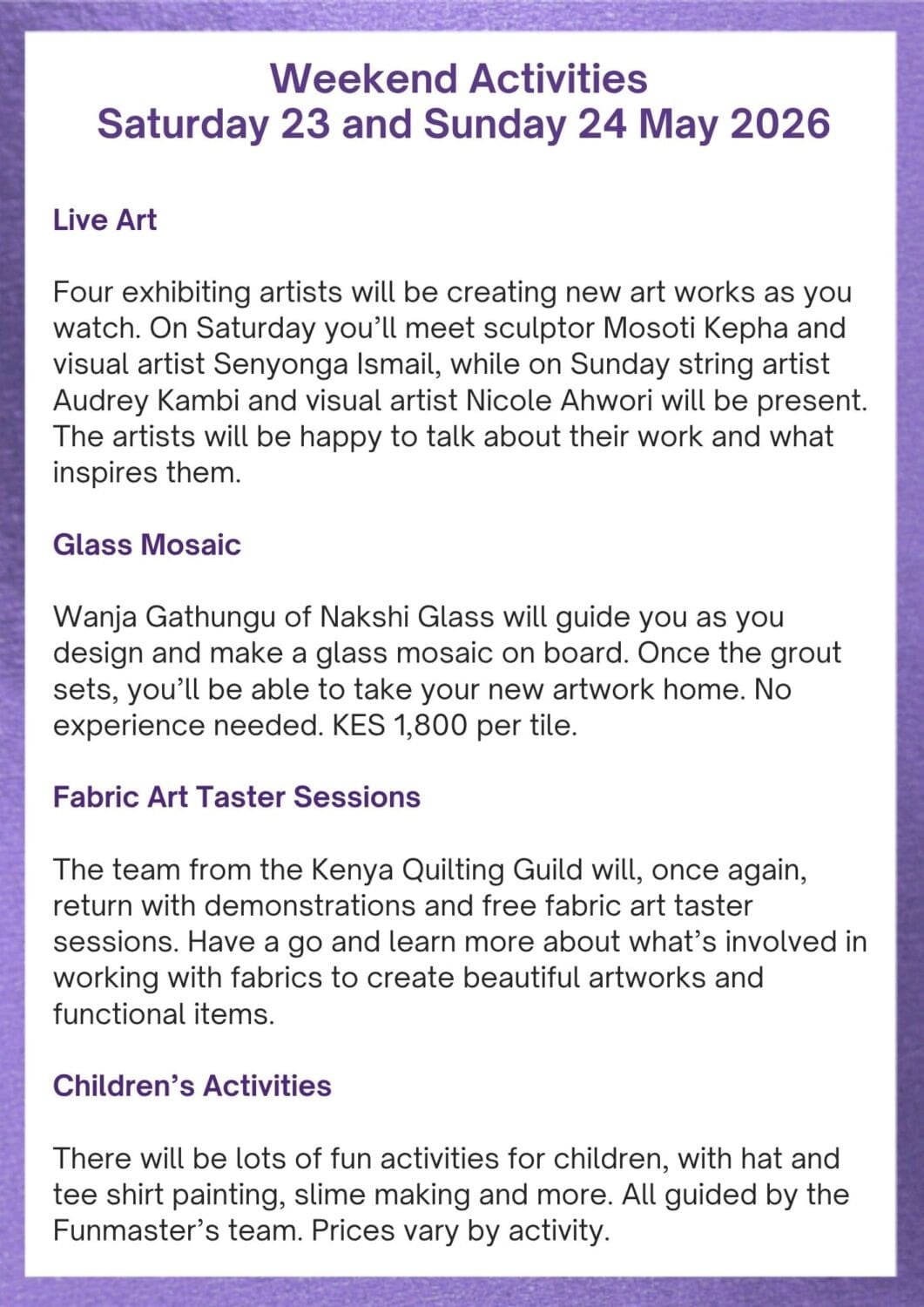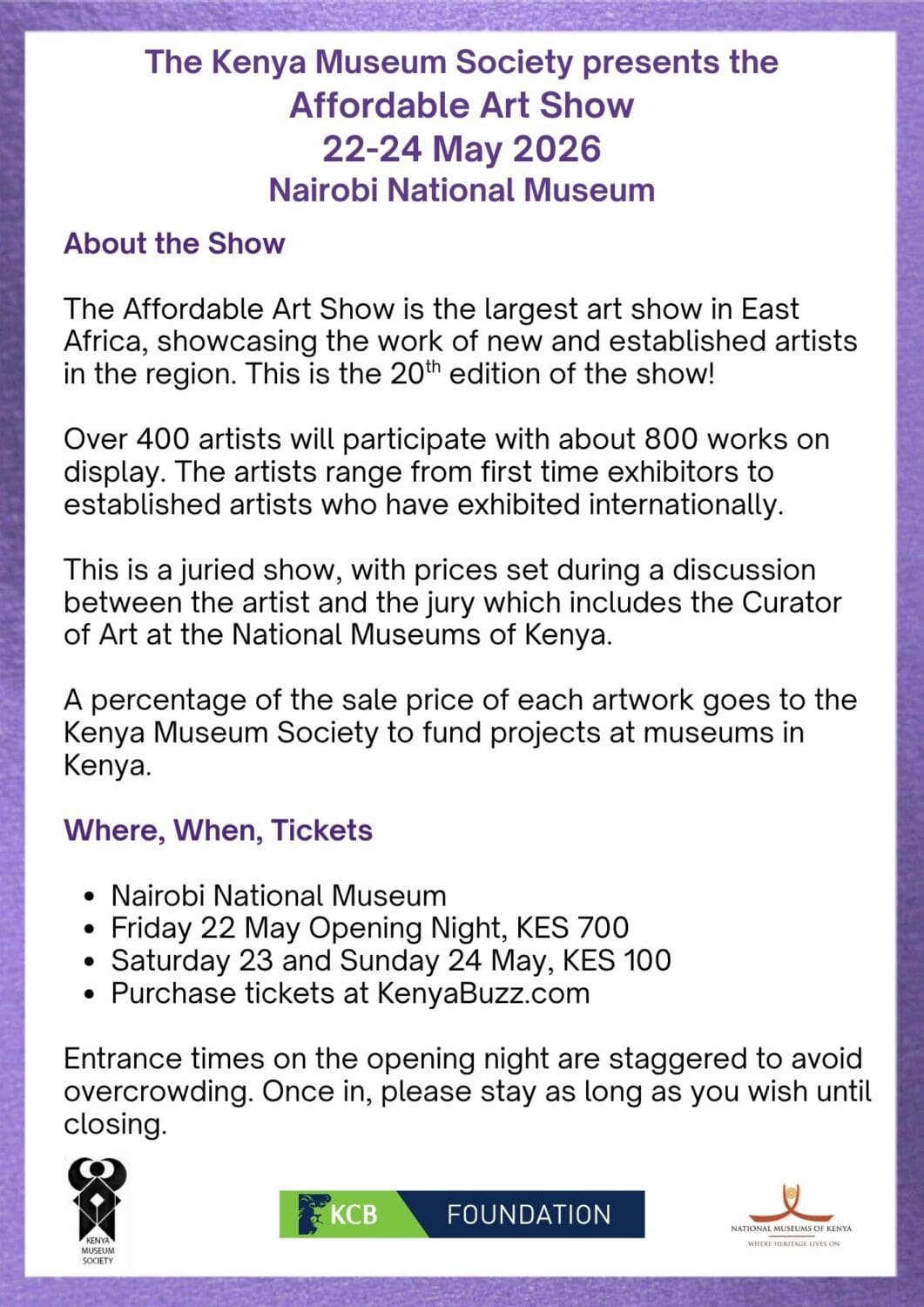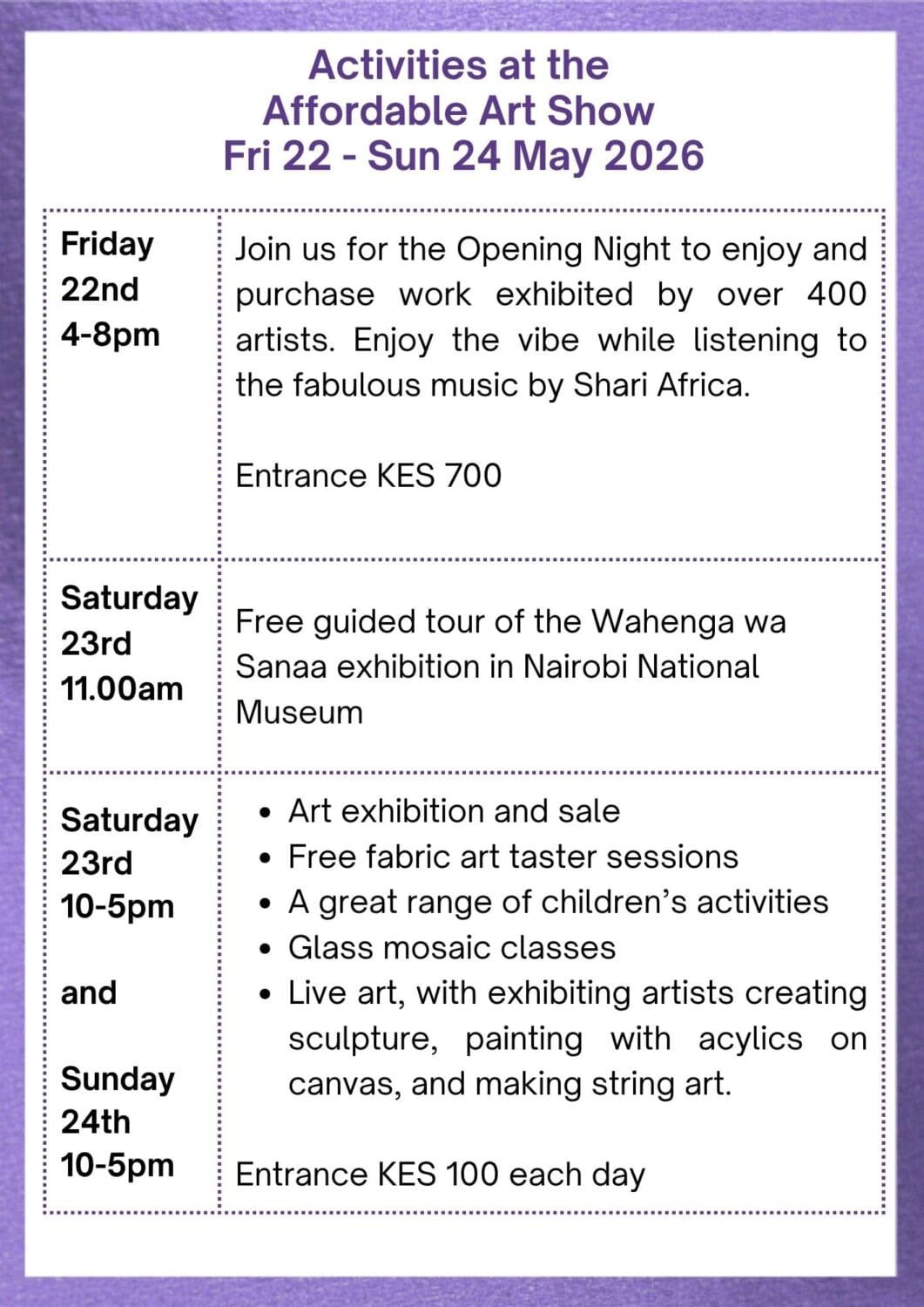 You are here: Home1 / Activities & Events2 / Events3 / Affordable Art Show Programme – 22-24 May 2026, Nairobi National...